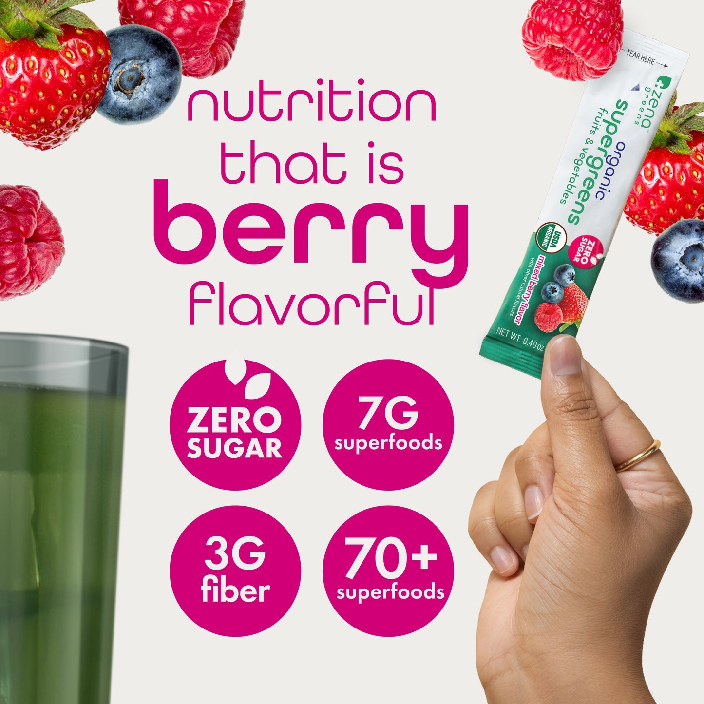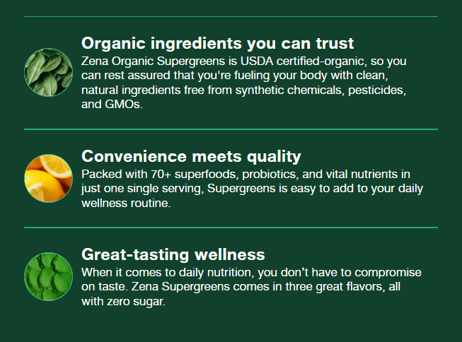 Zena Organic Supergreens is USDA organic certified and offers a uniqueblend of fruits, vegetables, superfoods, digestive enzymes, and probiotics.